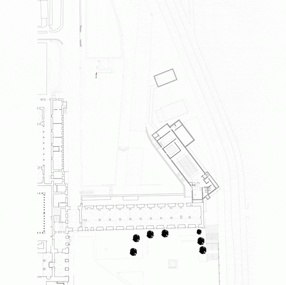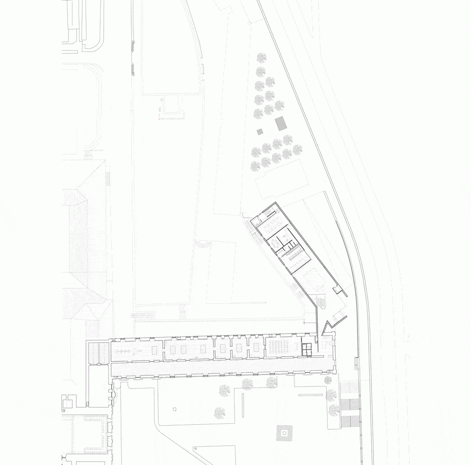 A recess in the corner of the new building creates a sheltered entranceway, leading into a shared atrium and gift shop for the two museums. In this way, visitors are encouraged to visit both.