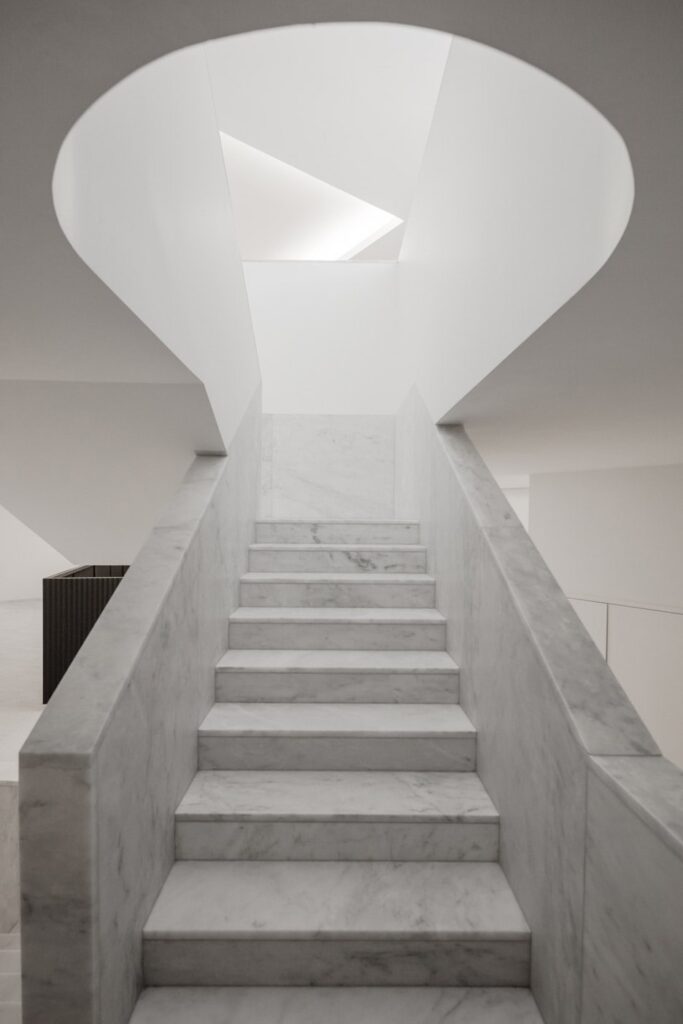 It provides flooring throughout and covers sections of the walls in the public areas. It also covers the main staircase, lending it a sculptural quality.