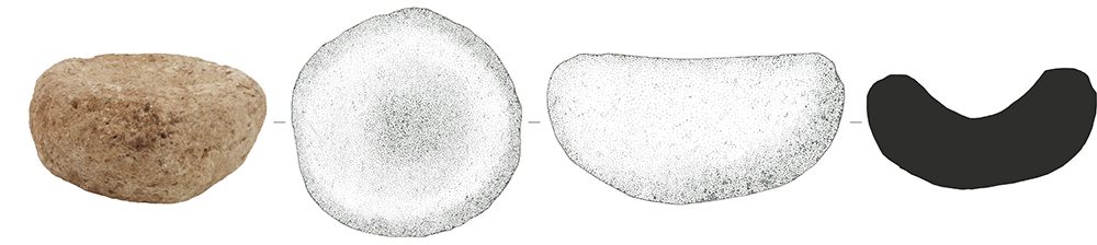 Almofariz de pequena dimensão de planta circular, assimétrica, com face superior côncava levemente irregular. Superfície irregular e pouco polida.