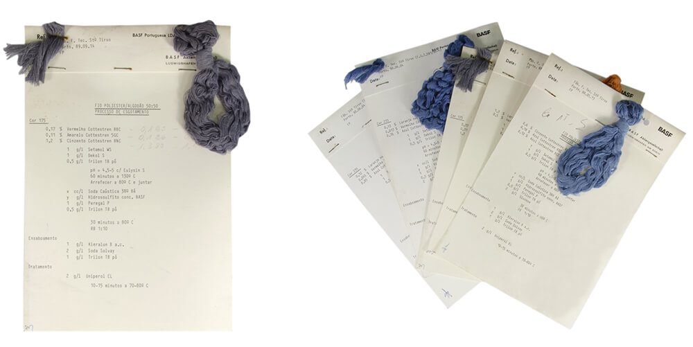 Fichas técnicas de tingimento de fios através do processo de esgotamento. Catálogo de amostras de fio de algodão e poliéster com referências à formação da cor, tratamento e ensaboamento.