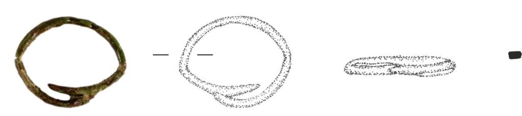 Anel. Fita de secção plano-convexa. Fecho efetuado por sobreposição do aro. Encontra-se deformado e fragmentado em dois pontos.