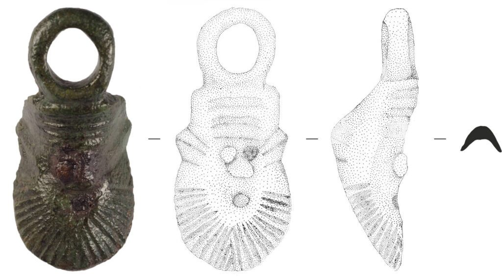 Armela figurativa de recorte ovalado com duas perfurações centrais, nos quais se conservam dois cravos em ferro. Peça larga e espessa onde a face representada (sátiro) possui apenas o nariz e a boca bem vincados, rodeados de barba estilizada, através de pequenas incisões radiais. As molduras horizontais constituem a decoração da junção do mascarão e o anel de suspensão.
