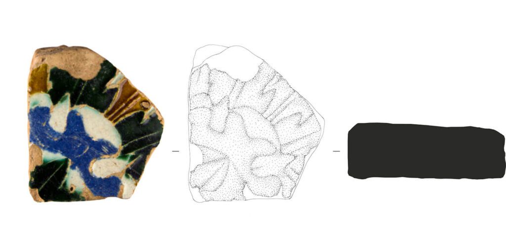 Fragmento de azulejo tipo hispano-árabe elaborado a partir da técnica de aresta ou “cuenca”. O motivo decorativo apresenta uma composição estilizada com laçarias e motivos naturalistas.