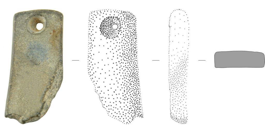 Fragmento de braçal de arqueiro. Formato e secção retangular, ligeiramente assimétrico. Superfícies planas e cantos arredondados. Orifício de perfil troncocónico ligeiramente descentrado e de recorte irregular. Polimento integral.