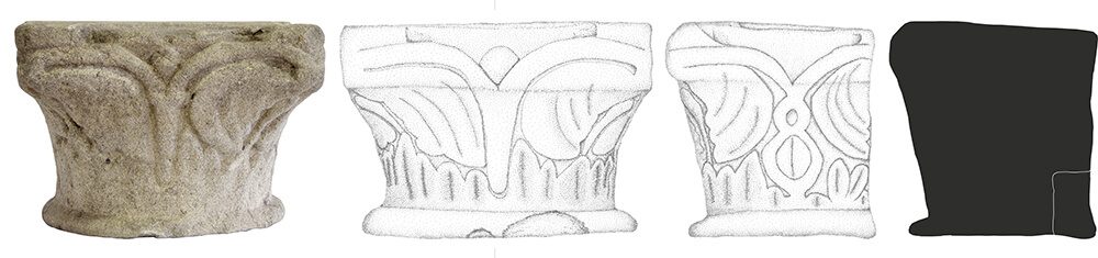 Capitel de apoio de coluna adossada. Estrutura piramidal marcada na face inferior por toro saliente. Composição decorativa assimétrica, composta por motivos estilizados de cariz naturalista, conjugados com laçarias.