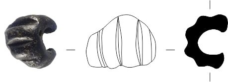 Fragmento de conta de formato tubular, ligeiramente assimétrica. Orifício centrado de perfil reto. Decoração composta por gomos verticais moldados a quente, por pressão.