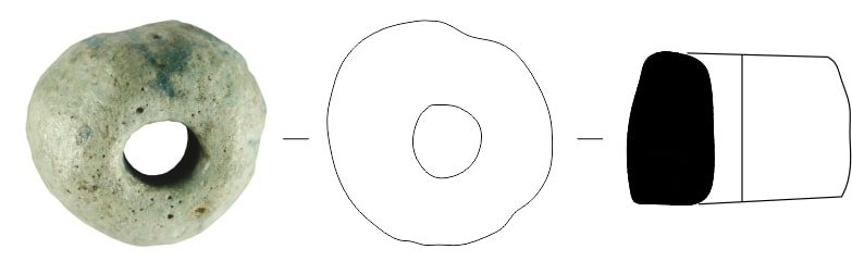 Vidro. Pasta vítrea de cor azul-turquesa (2.5B7/6), opaca, de baixa qualidade, com impurezas e bolhas de ar. A superfície encontra-se corroída e mal conservada.