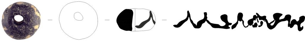 Conta em pasta vítrea, negra, com inclusão de meandro em pasta branca. Formato circular, assimétrico, de espessura variável. Orifício de suspensão de perfil circular, descentrado e levemente obliquo.