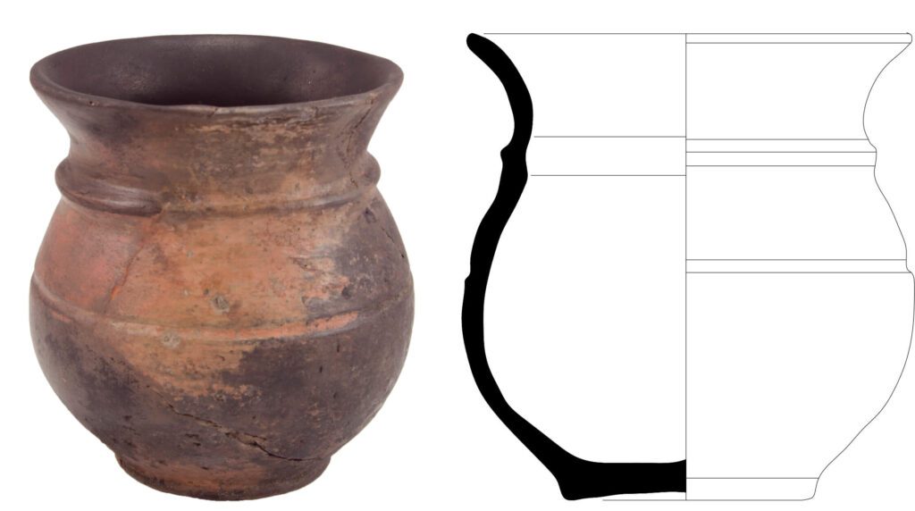 Perfil sinuoso em S. Bordo esvasado com lábio arredondado virado para o exterior. Fundo com pé discóidal, ligeiramente côncavo, com espessamento no interior. Decoração composta por um friso localizado no arranque do bojo de perfil triangular e canelura na parte superior do bojo de secção em U.