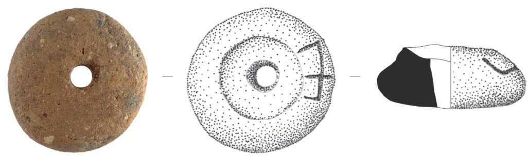 Cossoiro bitroncocónico com carena no terço inferior, de perfil arredondado, ligeiramente assimétrico. Orifício troncocónico invertido, descentrado em relação ao eixo. O orifício foi efetuado do fundo para o topo o que provocou o arrastamento e acumulação da pasta no topo superior. Cavidade superior pouco profunda com rebaixamento regular desde a aresta superior ao centro do orifício. Conserva um grafito na face lateral, implantado entre a carena e o topo superior, composto por três hastes verticais, paralelas entre si, unidas na base por um traço horizontal.