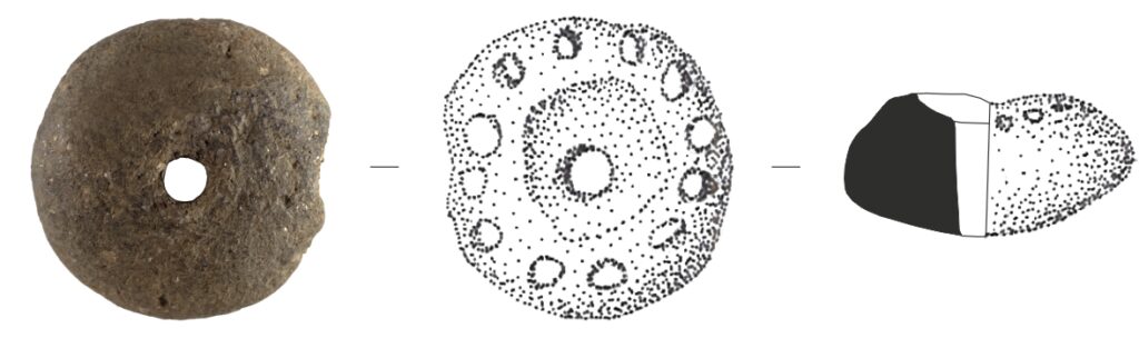 Cossoiro bitroncocónico com carena de perfil arredondado implantada no centro da face lateral. Fundo plano-convexo. Orifício centrado ao eixo da peça de recorte cónico, ligeiramente assimétrico. Cavidade superior pouco profunda de recorte muito irregular, com rebaixamento suave e progressivo desde a aresta superior ao limite do orifício. Decoração composta por 12 círculos incisos inscritos na face superior dispostos radialmente à volta do orifício.