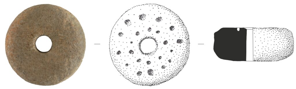 Cossoiro discóidal de paredes retas de espessura irregular, assimétrico, com arestas arredondadas. Orifício de perfil cilíndrico, descentrado em relação ao eixo, com ligeira deformação na face superior. Faces laterais levemente deterioradas. Superfícies polidas e bem regularizadas. Decoração composta por pequenos orifícios incisos na face superior, organizados em dois círculos concêntricos dispostos à volta do eixo de fixação da haste do fuso.