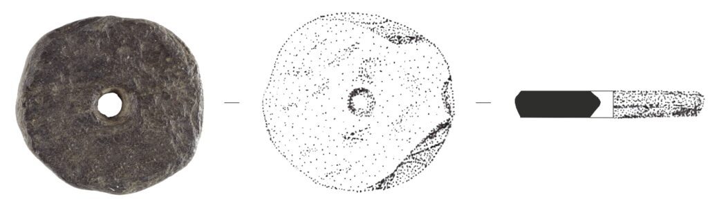 Formato discóidal de recorte irregular. Secção plana de espessura variável. Faces laterais verticais, muito irregulares, com arestas erosionadas. Orifício descentrado de perfil bitroncocónico, com eixo ligeiramente oblíquo.