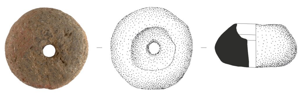 Cossoiro bitroncocónico com carena intermédia de recorte arredondado localizada no terço inferior. Fundo plano-convexo. Orifício descentrado em relação ao eixo da peça de perfil troncocónico. Cavidade superior profunda, com inclinação progressiva da aresta superior ao limite do orifício.