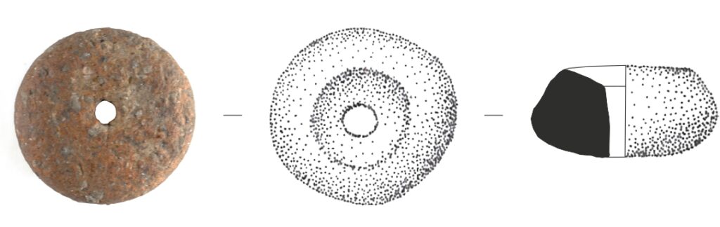 Formato amendoado de recorte simétrico. Talhe bifacial, assimétrico. Encontra-se parcialmente fraturado ao nível do córtex e do bico. Arestas erosionadas de perfil arredondado. Superfície com lustre e pátina acentuada.