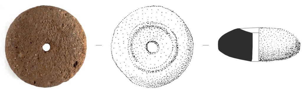 Cossoiro discóidal de parede curva e recorte arredondado a configurar uma carena intermédia muito suave. Orifício centrado em relação ao eixo, de perfil troncocónico invertido. Cavidade superior larga e pouco profunda. Apresenta como decoração um círculo concêntrico no interior a marginar a aresta. Na face lateral, ao nível da carena, apresenta também uma linha incisa que sugere uma divisão da peça em duas partes iguais.