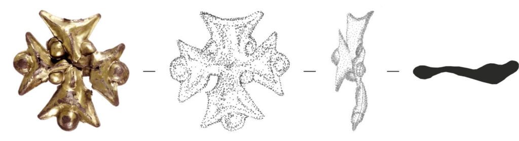 Cruz de braços iguais, de perfil triangular, rematada na face superior dos braços por motivos esféricos, assim como na junção da face inferior dos braços, junto ao centro. O processo de fabrico consistiu na união de duas faces iguais, através de soldagem em toda a periferia. O volume da peça é produzido através da criação de nervuras centrais que se desenvolvem através dos braços em direção ao centro da cruz. O douramento, ainda que bem conservado, apenas se regista numa das faces e é composto por uma finíssima película.