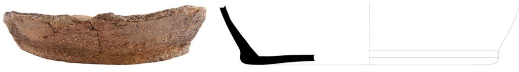 Cerâmica. Pasta compacta de estrutura laminar com cozedura uniforme (P47). Elementos não plásticos compostos por quartzo, feldspato e, em maior percentagem, mica. Superfície alisada e muito polida com partículas de mica à superfície (P47). Conserva sinais de exposição ao fogo na face inferior, junto ao fundo.
