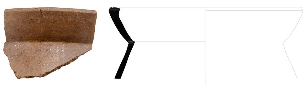 Fragmento de bordo e arranque de parede de dollium. Parede arqueada evidenciando um bojo baixo e largo, marcado por uma carena interna muito vincada de demarcação dos dois planos.