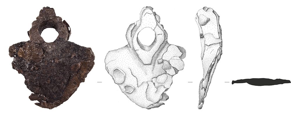 Enxada (sarculum). Lâmina de formato triangular com «ombros» horizontais e arestas arredondados, dividida por uma nervura central que se prolonga até ao final da lâmina. Orifício de fixação ligeiramente elevado de perfil troncocónico. Na face exterior, no eixo oponente à lâmina, é encimado por uma protuberância de secção trapezoidal.
