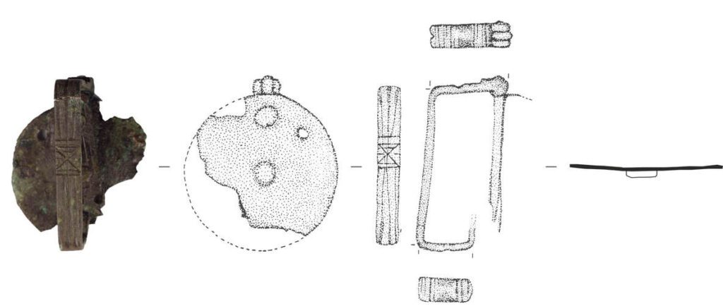 Espelho de fechadura com asa. Espelho circular com ligeiro rebordo na parte superior. Encontra-se levemente fraturada na face inferior. Possui quatro orifícios para fixação. Asa de formato retangular fixada ao «espelho» através de dois rebites. Na parte superior possui uma charneira que possibilitaria a articulação necessária para elevar a tampa. A asa na face superior encontra-se decorada com três linhas longitudinais incisas que, na parte central, formam um quadrado decorado com linhas cruzadas. A peça pertenceria, provavelmente, a uma pequena arqueta de madeira e funcionaria simultaneamente como asa e de articulação da tampa.