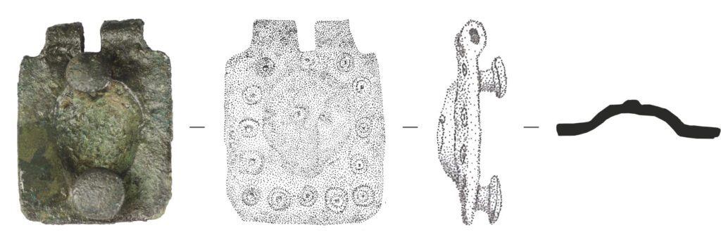 Revela uma clara filiação morfológica e estilística com os materiais tardorromanos do vale do Douro. O mesmo tipo de decoração é percetível na placa de cinturão proveniente da estação arqueológica de La Bienvenida, Ciudad Real, com cronologia centrada no séc. V (AURRECOECHEA; FERNANDÉZ; KLINK 1986, 255, est. I, n.º 8). À mesma gramática formal e decorativa pertencerá uma fivela peltiforme proveniente de Monsanto, Idanha-a-Nova, decorada com dois animais (leões?) afrontados (PONTE, MARQUES 1980, 60-61, fig. 2). As características deste tipo de peças definidas por Sommer (SOMMER 1984), e tipologicamente subdivididas em variantes por Bohme (BOHME 1986, 482-485), enquadram o nosso exemplar no tipo Sissy de dispersão fundamentalmente gálica que apresenta como decoração cabeças de leões afrontadas.
