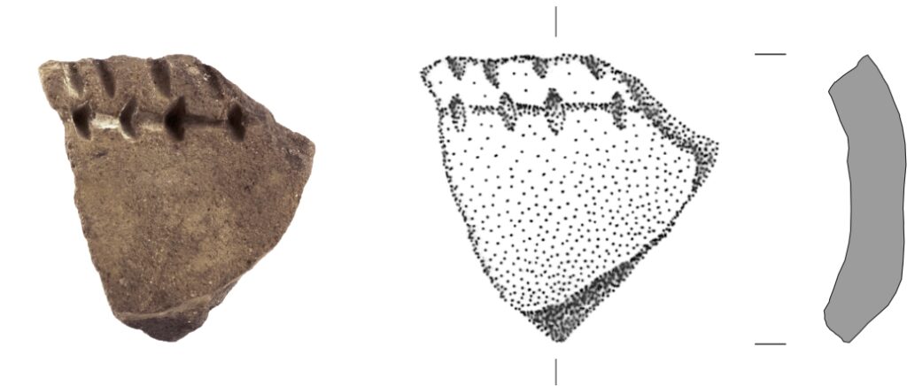 Fragmento de parede de vaso de modelação manual. Decoração composta por motivos incisos de formato oval, efetuados a punção com vestígios de preenchimento de pasta cerâmica branca.