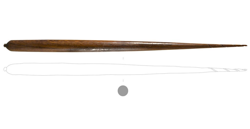 Perfil cónico com base arredondada provida de eixo central de encaixe do cossoiro. No terço superior encontra-se encavado um sulco de condução do fio. Novelo de linho contemporâneo de produção local.