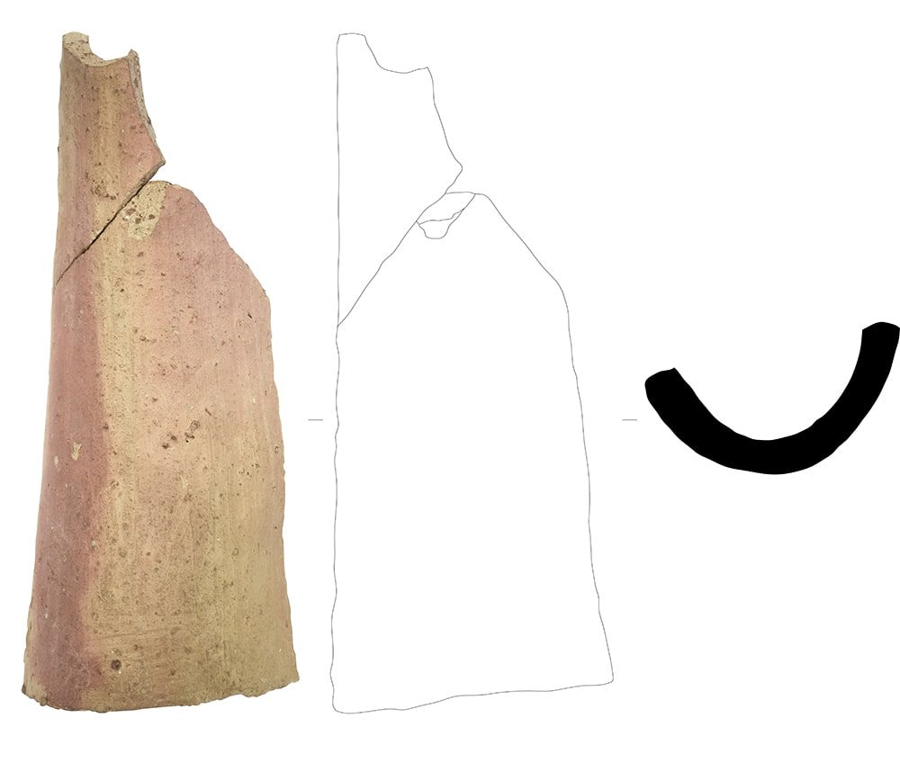 Formato trapezoidal com curvatura irregular e assimétrica em relação ao eixo da peça. Forma de meia cana, aberta e baixa pela parte inferior, mais alta e também aberta pela parte superior. Espessura irregular. Fraturada no topo superior direito.