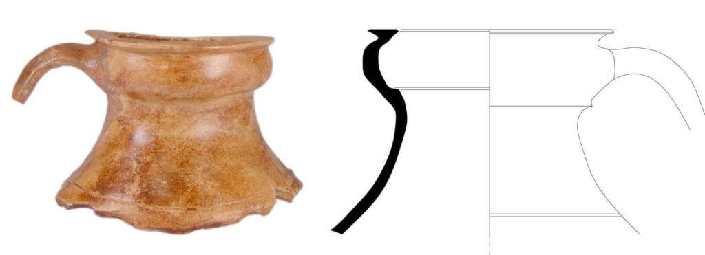 Fragmento de bordo e arranque de parede de jarro de médias dimensões. Parede arqueada desenvolvendo um reservatório de perfil oval. Gargalo curto de perfil arredondado, ligeiramente espessado. Bordo de secção triangular com face superior horizontal, projetado para o exterior, configurando uma aba curta de perfil anguloso. Asa de fita aplicada ao nível do gargalo, com secção plano-convexa.