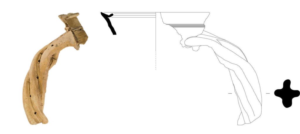 Fragmento de bordo e asa de jarro. Bordo extrovertido rematado por lábio triangular projetado para o interior a configurar uma aba de perfil em U. Asa formada por quatro nervuras de contorno arredondado, torcidas entre si, decorada por um conjunto de orifícios, dispostos aleatoriamente.