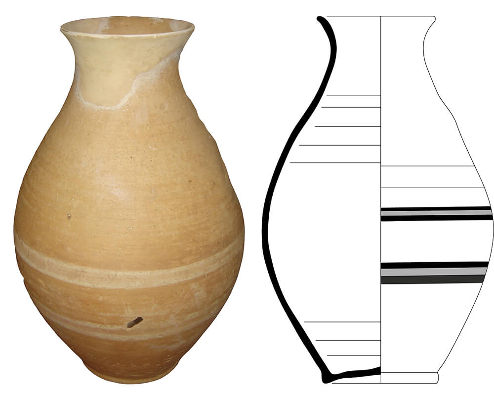 Jarrode perfil em S de corpo oval. Colo curto e medianamente estrangulado e bordo extrovertido com lábio arredondado de projeção oblíqua. Apresenta o negativo da implantação da asa ao nível superior do corpo, encontra-se fragmentado ao nível do bordo onde se encontraria implantada. Fundo discoidal de perfil côncavo e assentamento lateral, com aresta excisa de perfil arredondado. Peça pintada ao nível do terço superior do corpo com duas bandas paralelas, sendo cada uma delas composta por duas linhas brancas (K92,) e uma de cor ocre (L29) no meio.