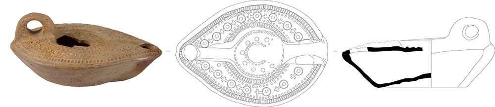 Lucerna em cerâmica comum decorada. Disco circular e prolongado por um canal largo. Bico de recorte oval sem destaque. Influbium de recorte circular, parcialmente fragmentado. Orla decorada com motivos geométricos formados por traços incisos e elementos em relevo com cruzes, círculos e pontos, obedecendo às regras de repetição simples. A asa é uma pegadeira perfurada implantada diretamente no rostrum. Fundo côncavo de assentamento radial.