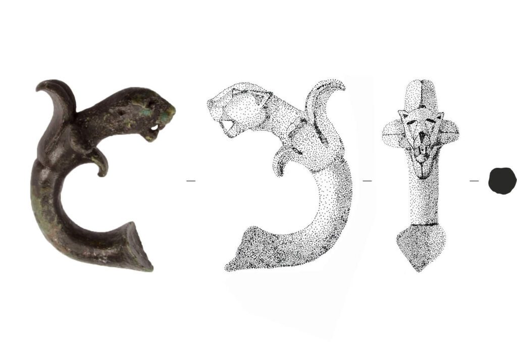 Pega de lucerna em bronze com representação de cabeça de leão moldurado por quatro folhas. A representação do felino reveste-se de um realismo assinalável. A pega desenvolve um arco semicircular revelando no seu extremo inferior uma área de encosto de perfil concavo de adaptação à face anterior do corpo da lucerna onde estaria soldada. A moldura, a partir da qual se desenvolve a representação felina, é formada por quatro folhas que desenham um perfil curvo.