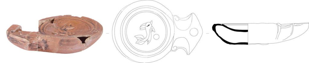 Lucerna com discus de corpo troncocónico com influbium circular e volutas em ponta no rostrum. As volutas nascem dos vértices do triângulo que desenha o extremo do rostrum dispondo-se uma em cada lado. Margus estreito, separado do discus por três molduras. Discus amplo, ligeiramente côncavo, decorado com um golfinho à direita. Orifício de alimentação ligeiramente descentrado.