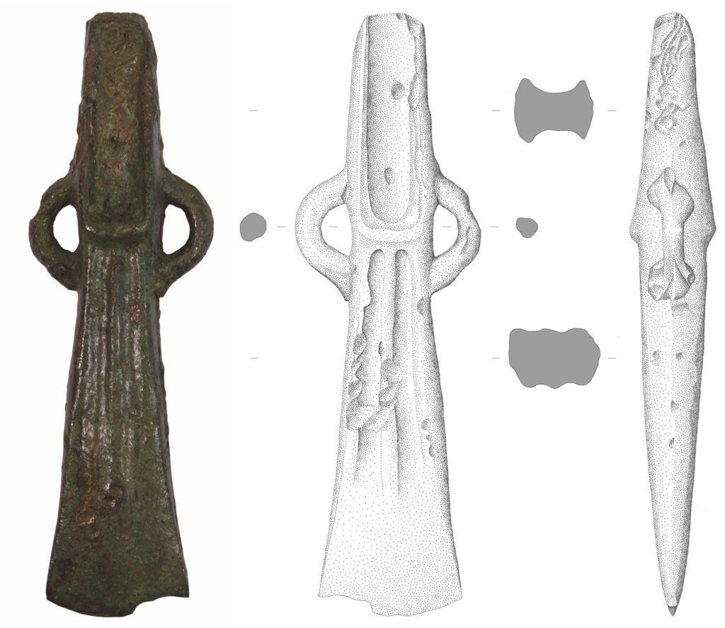 Talão com ressalto médio, elevado e espesso, com abas laterais decrescentes para o topo. Asas compostas por anéis de secção subcircular de diferente dimensão e levemente assimétricos. Ausência de cone de fundição. Talão levemente desgastado no topo. Inexistência de rebarbas de fundição e abundantes vestígios de utilização ao nível da lâmina, talão e gume.