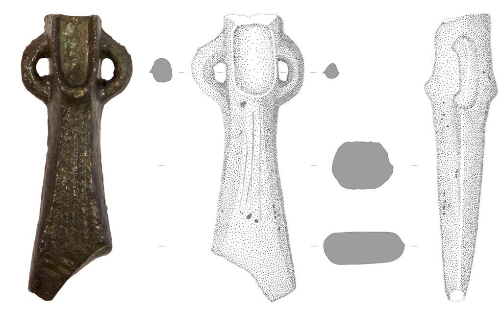 Machado de talão de dupla aselha e faces simétricas. Encontra-se fragmentado ao nível do arranque do talão que corresponde ao limite superior dos anéis. Lâmina plana e espessa, alargada, com gume de perfil curvo, isenta de nervuras. Lâmina de secção trapezoidal fragmentada ao nível do gume. Talão retangular com ressalto médio e espesso com abas laterais, fragmentado ao nível do arranque inferior. Anéis de secção subcircular, assimétricos, implantados no centro das faces laterais dividindo a lâmina do talão. Ausência de rebarbas de fundição. Os vestígios de utilização são visíveis em ambas as faces da lâmina e no gume.
