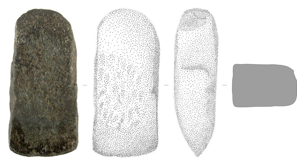 Machado integralmente polido. Contorno retangular e gume plano-convexo. Secção subretangular. Talão largo e irregular com vestígios de precursão. Gume afiado com vestígios de utilização.