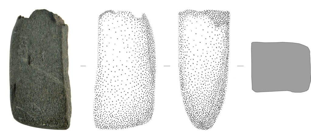 Fragmento de machado integralmente polido. Contorno trapezoidal, simétrico. Gume plano-convexo, descentrado e assimétrico. Secção sub-retangular (?). Gume pouco afiado com vestígios de utilização.