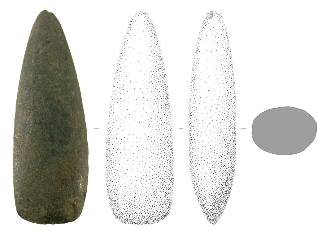 Machado integralmente polido. Contorno subelítico, alongado, de gume simétrico e contorno plano-convexo. Talão pontiagudo com vestígios de utilização. Secção subcircular. Gume afiado com vestígios de utilização.