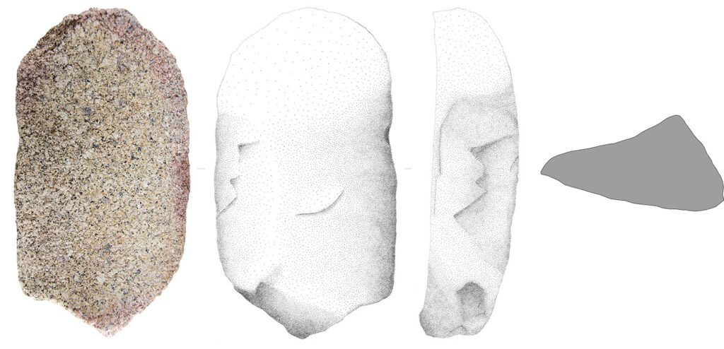 Mó manual (elemento movente) de contorno sub-retangular com as arestas arredondadas, fraturada numa das extremidades. Superfície superior convexa integralmente polida.