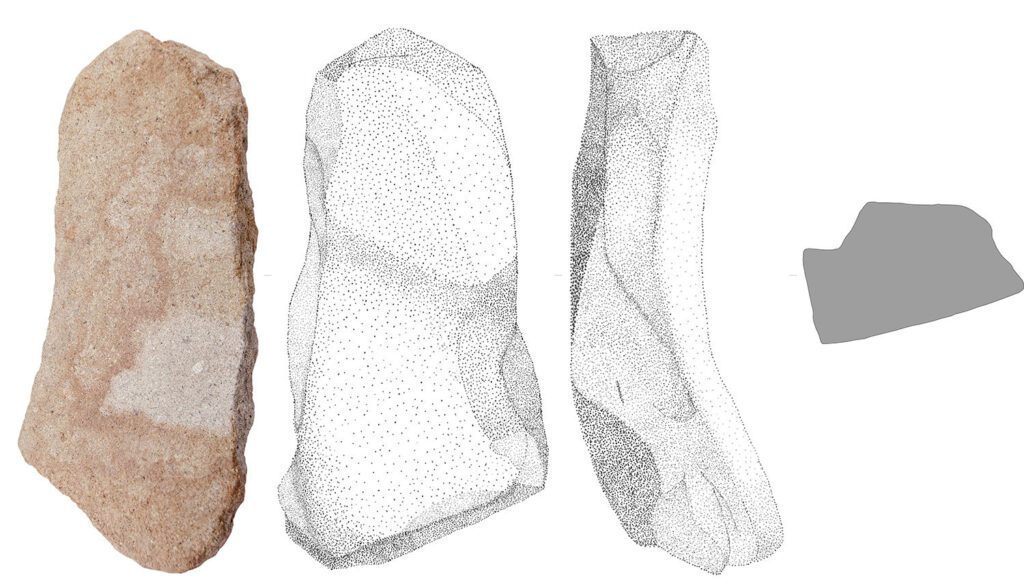 Elemento dormente de mó manual tipo naveta. Contorno barquiforme, sub-retangular, fraturado numa das extremidades. Superfície superior côncava integralmente polida. Faces laterais irregulares, sem afeiçoamento.