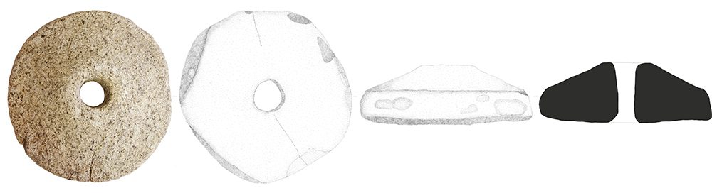 Elemento dormente de mó rotativa. Contorno circular, assimétrico, com orifício central de perfil cónico com faces laterais verticais. Secção cónica com topo superior descendente. Face superior polida com claros vestígios de utilização. Base plana e regularizada.