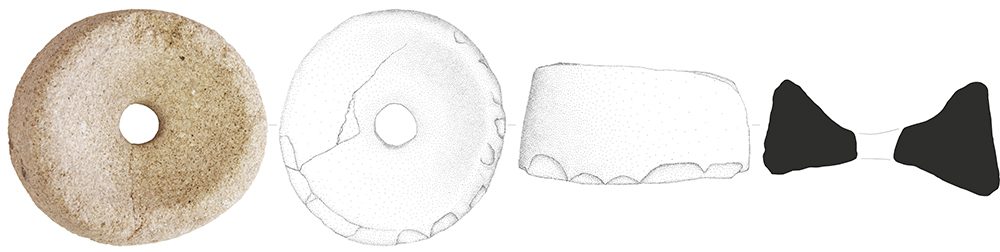 Elemento movente de mó rotativa. Contorno circular de recorte irregular com orifício central de perfil cónico e faces laterais retas. Secção assimétrica com desgaste acentuado. Face inferior côncava e topo superior convexo. Face inferior muito polida com claros vestígios de utilização.