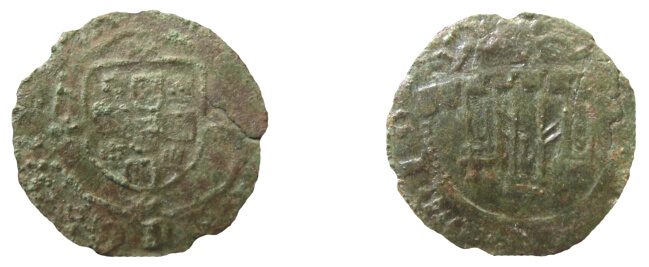 Anverso – [° CEPTA + DOMIN] – Campo limitado por legenda desenvolvida em bordadura, com castelo de três torres dentro de recinto muralhado e banhado pelo mar.