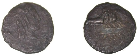 Denarius – L. Iulius Bursio – 85 a.C. Anverso – Busto de Jénius ou Apollo Vejovis à direita, laureado e com asas, tridente e símbolos atrás. Reverso – Vitória numa quadriga, no exergo L.IULI.BURSIO; orla de ponto.