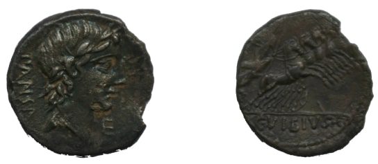 Denarius – C Vibius C. f. Pansa – 90 a.C. Anverso – Cabeça de Apolo laureada à direita e PANSA por detrás; marca junto ao queixo (E). Reverso – Minerva numa quadriga, C. VIBIUS.C.F. no exergo; orla de pontos.