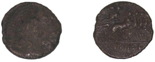 Anverso – Cabeça laureada de Apolo, para a direita, por trás PANS[A], para baixo; orla de pontos. Reverso – Minerva em quadriga, para a direita, com troféu na mão direita, lança e rédeas na esquerda. No exergo – [C VIBIUS CF]; orla de pontos.