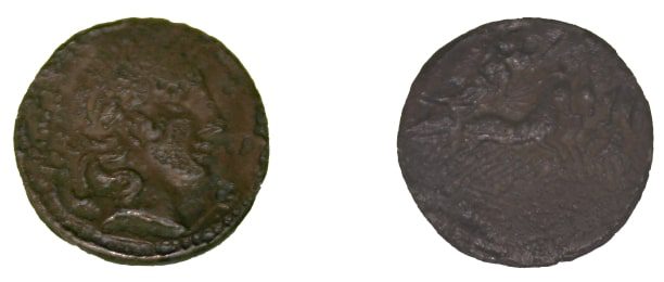 Denarius – C Vibius C. f. Pansa – 90 a.C. Anverso – Cabeça de Apolo laureada à direita; orla de pontos. Reverso – Minerva numa quadriga, C. VIBIUS.C.F. no exergo; orla de pontos.