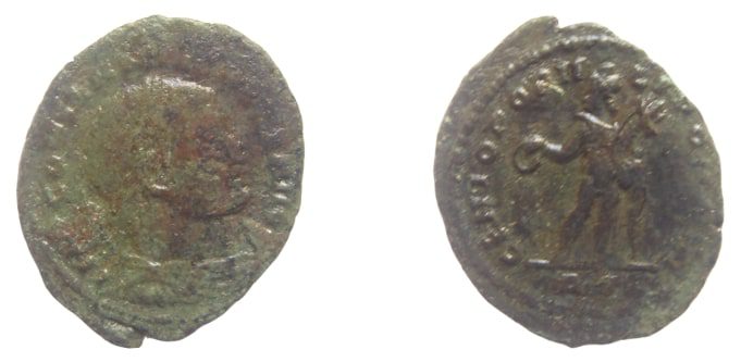 Follis, Constantius I, Roma, 312-313. Anverso – IMP CONSTANTINVS PF AVG – Busto laureado à direita. Reverso – GENIO POPV. LI ROMANI – RT – Génio, de pé, para a esquerda, com modius na cabeça, patera, na mão direita e cornucópia na esquerda; chamys pende-lhe do ombro esquerdo.